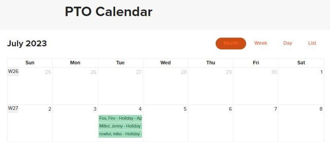 To view the PTO calendar, navigate to “PTO,” then select “PTO Calendar.” From there, you can filter the PTO Calendar view by date, employee, department, time off type, and request status.