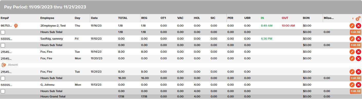 - Step 4: Inside OnTheClock, under the Time Cards page, you will reference the "Hours Sub Total" row for each employee, where it totals each payroll category for them.