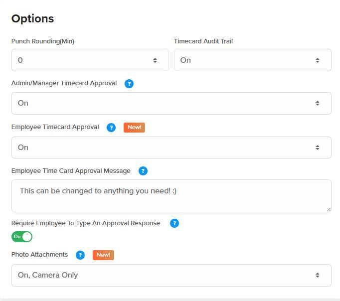 - Photo Attachments: Allows employees to attach photos to their clock punches. You can allow for uploads, or set to “Camera Only” to require a photo be taken at punch time.