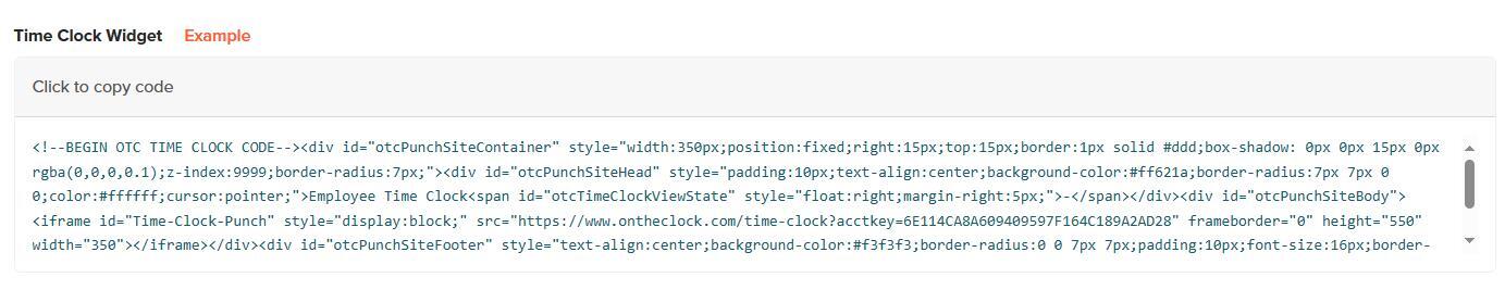 - Time Clock Widget: If you’d like your employees to punch from your business’s website, copy/paste this code.